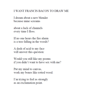 A writer I admire posted my poem, I WANT FRANCIS BACON TO DRAW ME, a few months ago, and it did not sit well with a few internet commenters. I have voiced in different settings I do not expect all of my poems to be welcomed. They are not sweet. I have a point of view. I have been waiting for someone to be offended. This was exciting to see even a handful of people argue. I tell people to not read the comments, but I fail to take my own advice. Art should be discussed. I can’t find an exact quote, but I think often about how one of the hardest things as an artist is to be ignored.